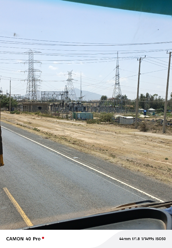 The image displays an outdoor daytime scene in Hells Gate ward, Kenya, captured from within a vehicle. In the foreground, a dark dashboard and a brown windshield wiper blade are visible at the bottom edge. An asphalt road with faded white and yellow lane markings extends from the lower left towards the center. Adjacent to the road, a wide expanse of dry, light brown soil with sparse, dry vegetation occupies the midground. The midground and background are dominated by extensive electrical infrastructure. Multiple lattice-steel transmission towers of various heights and designs, supporting numerous overhead power lines, are prominent. A large power substation is visible, containing several steel frameworks, insulators, transformers, and switchgear. Adjacent to the substation, a rectangular, single-story building with an unfinished, rough exterior and an empty window opening is present. Several container-like structures, including a green one and a smaller corrugated metal shed, are also within the substation area. On the right, wooden utility poles with cross-arms and lines are visible, along with some taller trees and distant, indistinct structures. The background features a clear, light blue sky with a few wispy white clouds. Distant, hazy blue mountains or hills are visible along the horizon behind the electrical installations. No individuals, specific actions, or interactions are discernible within the frame.