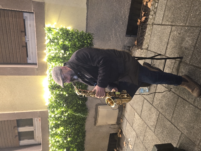 A man stands outside playing a saxophone. He wears a cap, dark coat, and blue pants with tan boots. He's positioned on a brick walkway next to a building adorned with bright lights. A black folding chair is behind him, and a clear water bottle is on the ground. A grate with fallen leaves is visible near the chair. The scene is likely at night, indicated by the light and shadows.