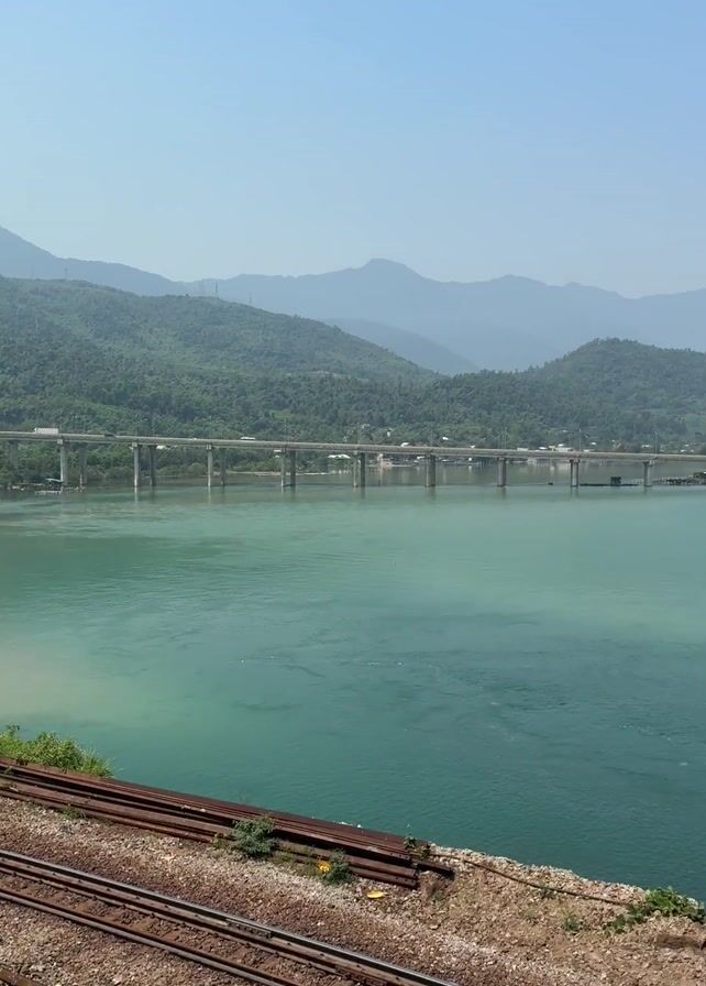 The video pans from left to right, revealing a wide shot of a river delta flowing into a bay. In the background, a mountain range is visible under a clear, pale blue sky. The river water is a light turquoise color, and a concrete bridge spans across the river. A sandy beach separates the river from the bay. On the beach are a few trees, buildings, and people. In the foreground, a section of railway track is visible.