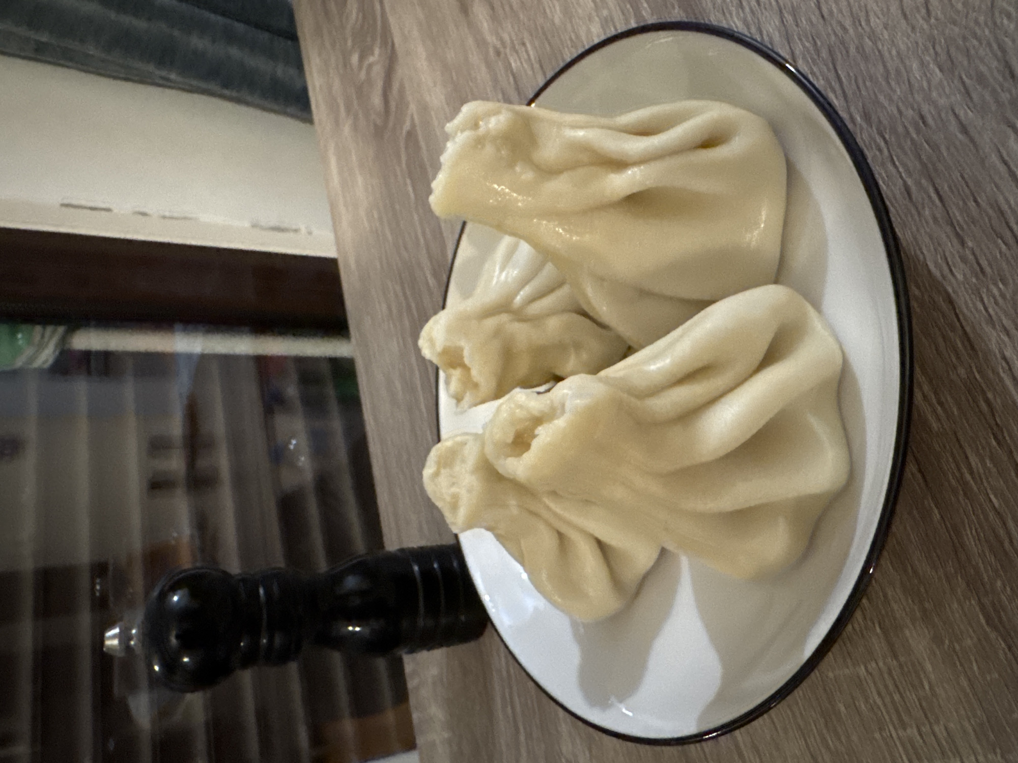 - "plate of three khinkali dumplings, likely freshly cooked, on a white plate with a dark blue or black rim" by FM-JSAz93, licensed under CC BY 4.0