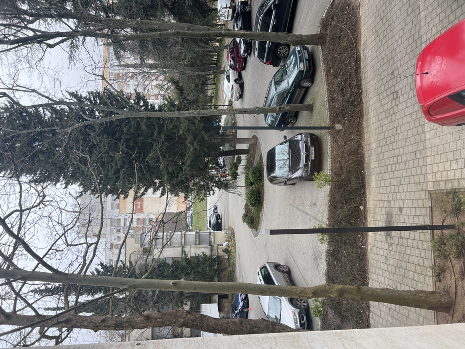 The image presents an elevated view of a residential parking area in Stara Zagora, Bulgaria, under an overcast sky