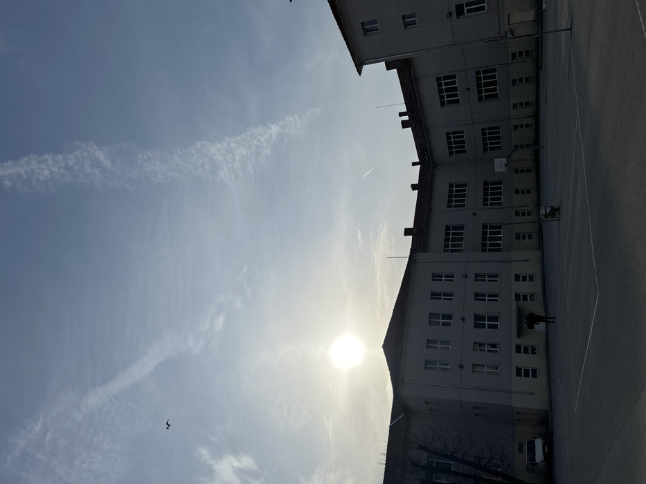 The image presents an outdoor scene within the city of Shumen, Bulgaria, primarily featuring a multi-story institutional building complex and an adjacent sports court under a bright, low sun. The sky, occupying the upper portion of the frame, is light blue with scattered wispy clouds. A prominent white contrail extends diagonally from the upper left, dissipating into cirrus-like clouds. A second, fainter contrail is visible in the upper right. The sun, a brilliant circular light source, is positioned low on the horizon, slightly left of center, casting significant glare. A dark, silhouetted bird with outstretched wings flies in the upper left quadrant. The main subject is an L-shaped building, likely a school or public institution, constructed with light grey facades on its upper floors and a lighter, yellowish-grey base at ground level. The building features red-tiled gable roofs, from which several antenna-like structures protrude. Numerous rectangular windows, appearing dark due to shadows or reflections, are arranged symmetrically across all visible sections of the building. In the foreground, an asphalt or concrete sports court, marked with faded white lines, is predominantly in shadow. A lone individual, silhouetted and appearing to wear dark clothing, stands on the court near an entrance of the building's left wing, facing the structure. A white panel van is parked adjacent to the left wing of the building, partially obscured by a bare tree branch. A single basketball hoop with a white backboard and rim is erected on the right side of the court, and a dark trash receptacle with a lid is situated near its base.