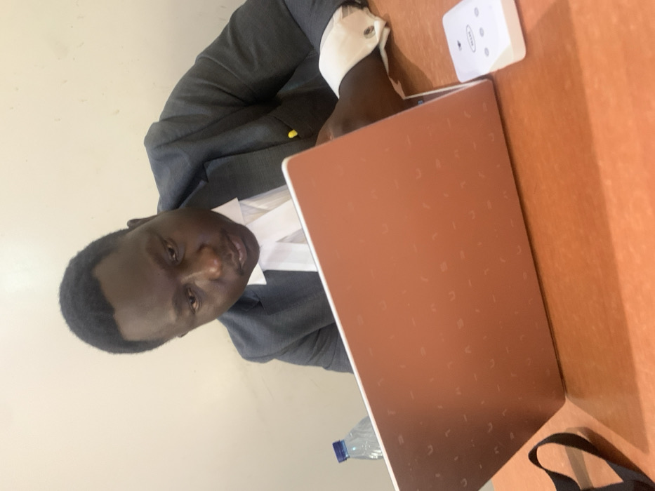 An adult male, identified as a legal professional by his attire (dark grey suit jacket, white shirt, and white barrister's bands), is observed indoors in what appears to be a professional setting within the city of Gombe, Nigeria