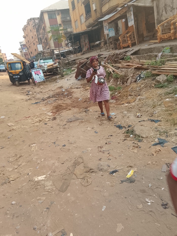 A woman in a patterned dress stands in a dirt-strewn street, holding a phone and a small bag. The background reveals a bustling urban environment with buildings, a three-wheeled vehicle, and people carrying lumber. Woodworking supplies and finished furniture are displayed near a shop. The road is littered with debris, suggesting an unkempt or possibly impoverished area.