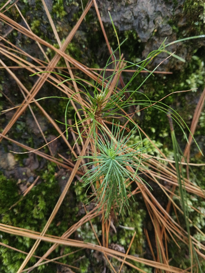 A close-up shows two small pine tree saplings amidst fallen brown pine needles and green moss. The bottom sapling features dense, short, green needles arranged in a radial pattern. The top sapling has longer, sparser, green needles, some with a slight curve. The needles lie scattered across a backdrop of moss and dark soil.