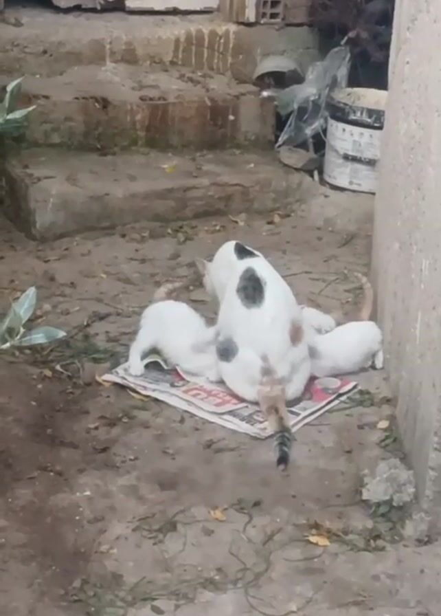 A white and black cat nurses three white kittens on a newspaper on the ground. The ground is dirt with some leaves and debris. Behind the cat are concrete steps leading to a white door. There is also a pile of bricks and a white paint bucket. The video is taken from a stationary position.