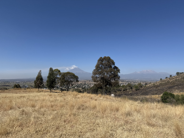 The image depicts a panoramic landscape overlooking San Gregorio Zacapechpan, Mexico, under a clear blue sky. The foreground is dominated by an expansive field of dry, golden-brown grass. In the midground, a cluster of four trees is visible, comprising three taller, slender trees and one broader, fuller tree. Below them, the town of San Gregorio Zacapechpan appears, characterized by numerous buildings with light-colored roofs scattered amidst green and grey patches. To the right midground, a sloping hillside is covered in dry vegetation with some darker, potentially burnt areas, and a large, leafy tree stands prominently. In the background, two prominent volcanoes are visible: to the left, Popocatépetl, a conical stratovolcano with a visible plume of white smoke or ash rising from its crater; to the right, Iztaccihuatl, an elongated, multi-peaked mountain with visible snow or light rock formations near its summits. The sky above is entirely clear and blue. No individuals or explicit human actions are present.