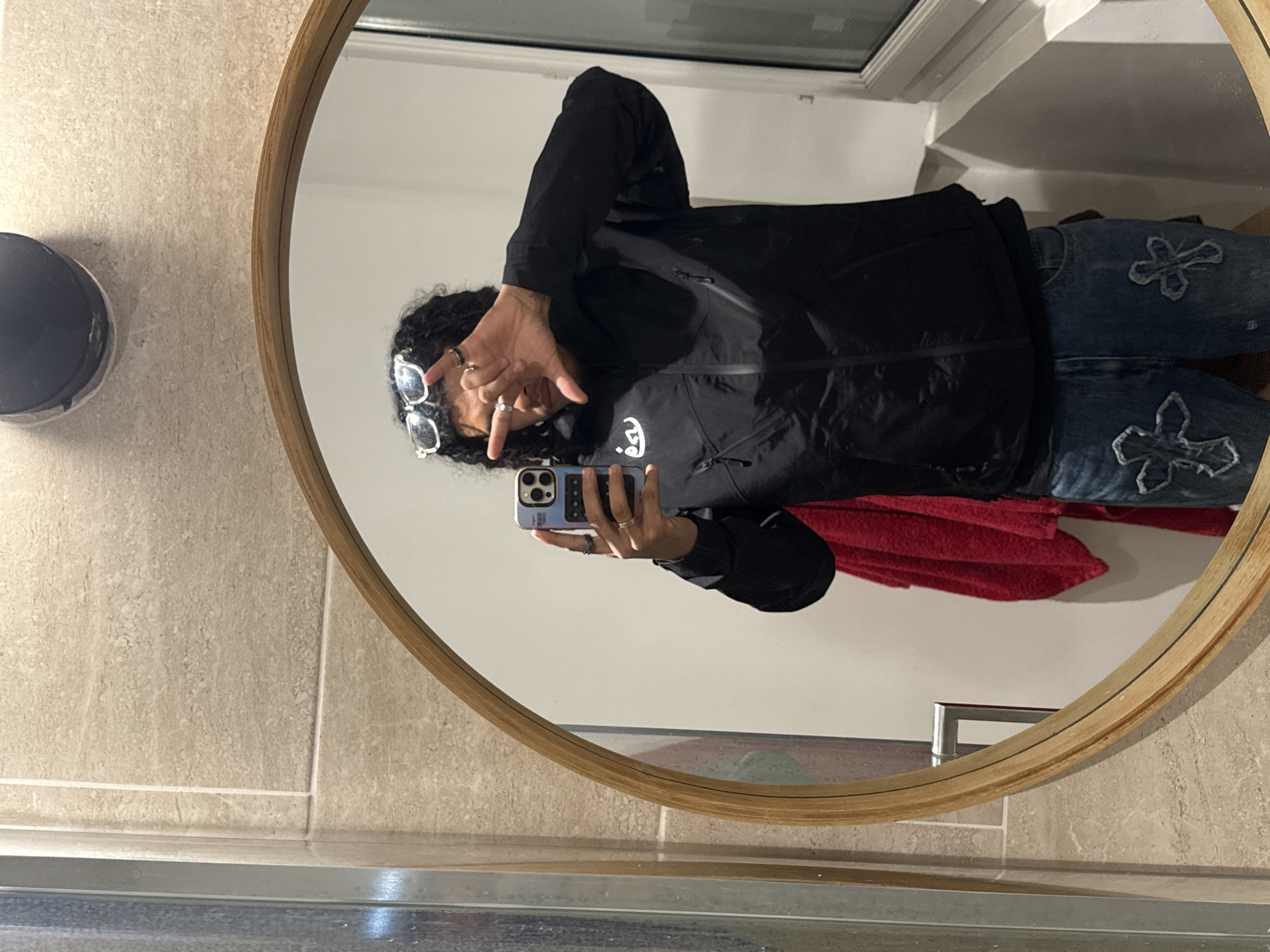 A reflection in a round, wooden-framed mirror shows a person taking a selfie. The person has dark curly hair and is wearing sunglasses, a black jacket with a white logo, and blue jeans with cross-shaped embellishments. They are holding a mobile phone in their right hand and making a hand gesture with their left. In the background, there's a bathroom with light-colored tiles, a red towel, and a black soap dispenser. A window frame is visible at the top of the reflection. The image does not provide enough information to determine if the location is in Massy, France.