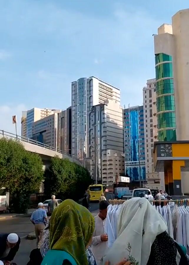 street scene in an urban area, likely in the Middle East. Several tall buildings of modern architecture dominate the background. An overpass spans above the street level. A yellow bus can be seen in the distance driving on the road. In the foreground, people wearing traditional Muslim clothing browse garments hanging on a rack. Two women, one in a green headscarf and another in a white patterned headscarf, are prominent in the frame. The sky is blue.