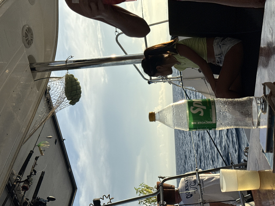 The image depicts a scene on the deck of a boat, likely at sea, off the coast of General Luna, Philippines, during late afternoon or early evening. The blue ocean extends to the horizon under a partly cloudy sky. In the foreground, a wooden table holds a clear plastic Sprite bottle, approximately half full, with condensation on its surface, and a frosted plastic cup containing a yellowish liquid. A smartphone lies face-down between these items. To the right, a young female is seated on a dark cushion, facing left and looking towards the sea. She has dark hair tied in a ponytail and is wearing a light-colored crop top and light-colored shorts. Her left hand is near her lap. Partially visible on the far right is the arm and shoulder of another individual, holding an object. In the mid-ground left, a male in a white "QUIKSILVER" t-shirt is partially visible, facing away from the camera and looking towards the sea. A small potted plant sits on a stand near him. Overhead, multiple fishing rods with reels are mounted to the boat's canopy structure. Several fishing lures, including a green and white squid-like lure, hang near the rods. A mesh net containing a green, fabric-wrapped object is suspended from the ceiling. Chrome support poles and railings are prominent throughout the boat's interior structure.
