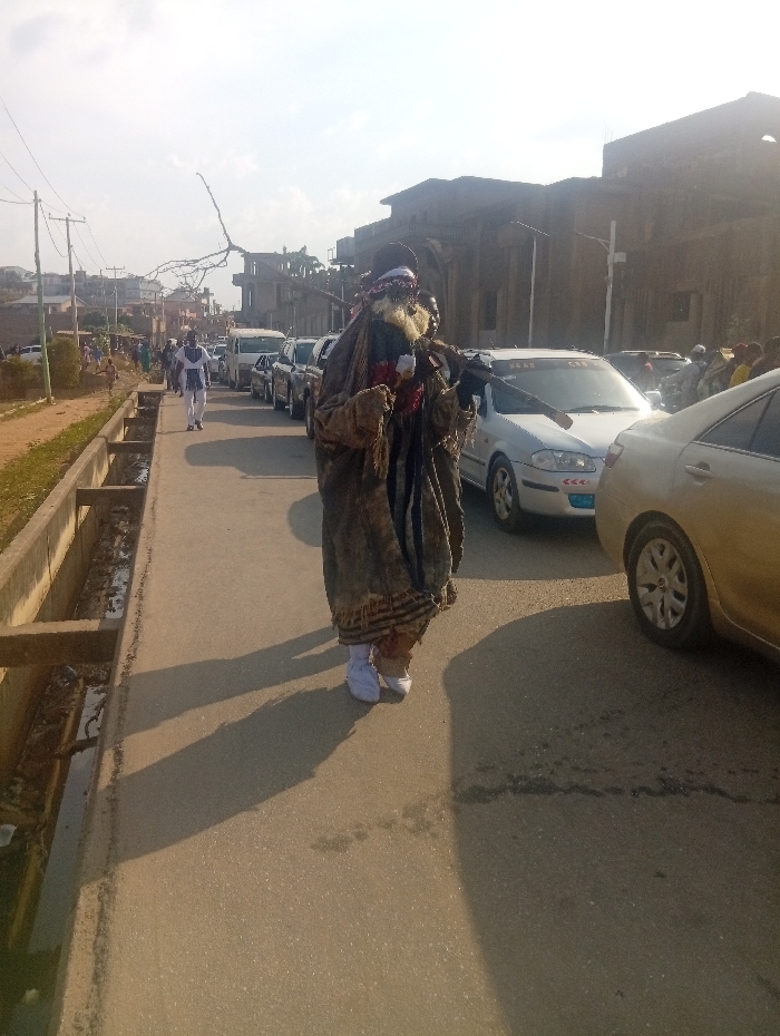 The image depicts a daytime street scene at Itakpe Junction, Nigeria. In the foreground, slightly left of center, a single individual stands or walks, adorned in an elaborate, multi-layered dark costume. This costume features a wide-brimmed dark hat with white and red fabric accents, a masked face with a white beard-like element, and a long, dark, rough-textured garment reaching to the ankles, covering white shoes. The figure holds a white cup-like object in the left hand and carries a slender, dark stick horizontally across the right shoulder. A distinct shadow is cast to the figure's right on the asphalt. To the left of the main figure, a concrete drainage ditch runs parallel to the paved road, containing some debris. Beyond the ditch, a dirt shoulder and utility poles with overhead lines are visible. Further down the road on the left, one person dressed in white clothing walks away from the camera, and other indistinct figures are present in the distant background. On the right side of the paved road, a line of vehicles is stationary or moving slowly. The closest visible vehicle is a silver sedan with a sticker on its windshield, followed by a partially visible gold sedan. A white van and other cars extend into the background. Buildings of varying styles, including a prominent large, dark, multi-columned structure, are visible in the far background. The sky above is clear and light, indicating bright daylight.