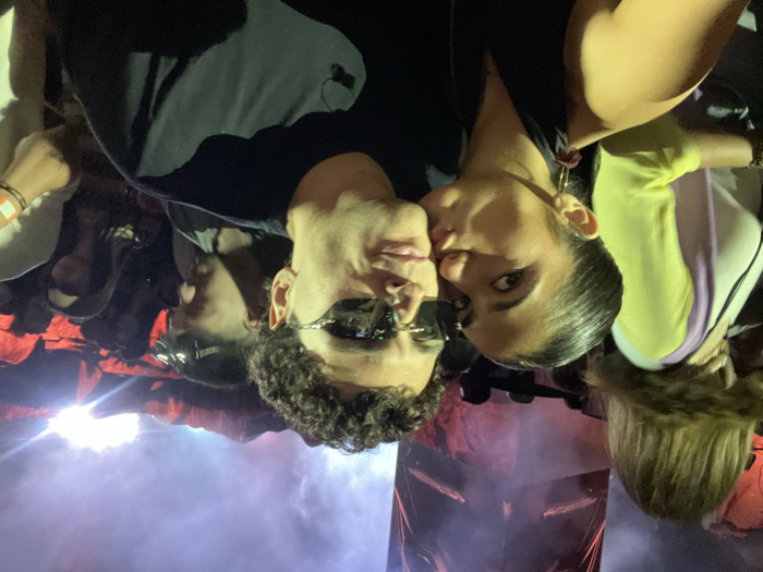couple in a close-up portrait, at an event in Braga, Portugal, located at coordinates 41.562, -8.432. The woman is on the left side of the image and is wearing a black sleeveless top with a low neckline and gold earrings. She is wearing dark lipstick and has dark hair pulled back. The man on the right is wearing a dark blue shirt with a white image on it. He is wearing black sunglasses and has short brown hair. The woman has her right hand on the man's shoulder and is looking at the camera with a playful expression. The man is looking at the camera and smiling. The couple is standing in front of a large crowd of people. There are bright lights shining on them. There is an out-of-focus backdrop of a large dark structure with an orange glow. The couple is clearly enjoying themselves. The image appears to have been taken at night. The event seems to be a large concert or gathering based on the crowd. The image is taken from a slightly elevated angle. The woman's left hand is visible on the right side of the image. The man's right arm is resting on the woman's shoulder and the woman's left arm is around his waist. The people in the background are facing toward the center of the image. There is a lot of activity happening in the background. The atmosphere appears to be lively and energetic. The image is well-composed and captures the couple's joy and excitement.