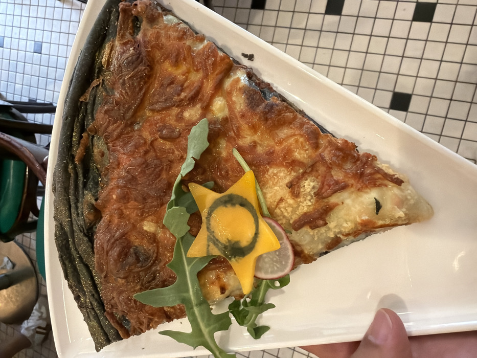 A slice of triangular quiche sits on a white triangular plate. The crust is black, and the filling appears to be a mix of cheese and vegetables. It is garnished with arugula leaves, thin radish slices, and a yellow star-shaped fruit decoration with a dark circle in the center. The plate is being held, and a black and white tile floor is visible in the background.