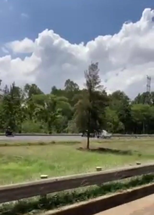 view from a vehicle driving along a road. A guardrail is visible in the foreground. Across a grassy median, there is a highway with cars and a motorcycle traveling along it. Beyond the highway, there is a line of trees, and overhead, a blue sky with large, fluffy white clouds. There is a tall communication tower in the distance.