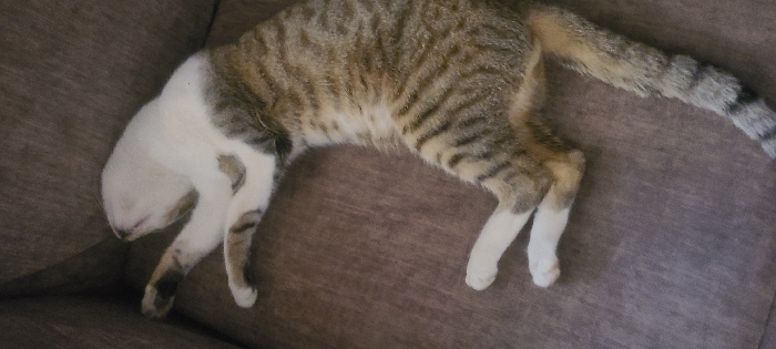 - "The image displays a domestic cat, identified by its patterned fur, resting on a textured, light brown or beige fabric sofa" by FM-uAW8F2, licensed under CC BY 4.0