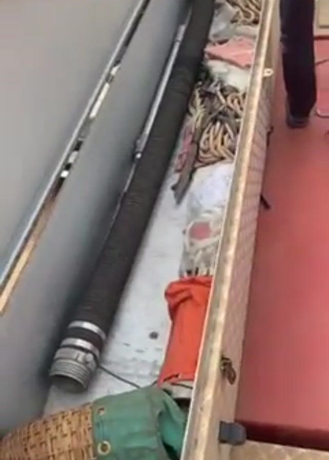 top of a fire truck. The top of the fire truck is red, and a man is standing on it. He opens a silver compartment. Inside the compartment is a long, black hose with silver clasps, several pieces of rope, an orange covering, and a wicker basket with a green cloth covering. The man walks on the top of the fire truck, and the video shows the tire, ladder, and circular opening to the water tank. The water tank is full.