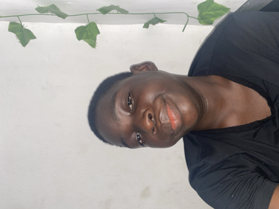 A dark-skinned individual with short, dark hair smiles at the camera. They are wearing a black shirt. The person’s face is well-lit. Behind them is a white wall with a green vine accent across the top. The image is rotated counter-clockwise.