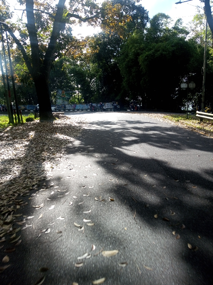 The image displays an outdoor scene in Phonengam, Laos, under bright daylight. A dark asphalt path, scattered with numerous dry, fallen leaves, extends from the foreground towards the middle distance. The sun, originating from the upper left, casts long, defined shadows of trees and objects across the path. On the left side, a large tree with a thick, dark trunk stands prominently, its canopy partially visible. An accumulation of dry leaves lines the left edge of the path near the tree's base. Further left, what appears to be utility poles are visible. In the middle ground, a low concrete barrier, painted white and blue, separates the path from an area where approximately eight to ten motorcycles are parked or stopped. Several individuals are standing or sitting near these motorcycles. Behind the barrier, a wall section is visible, adorned with colorful graffiti. A traffic light structure is identifiable behind the main tree, near the graffiti wall. The background is dominated by dense green foliage, including substantial bamboo clusters on the right side. On the far right of the path, a metal railing runs alongside, and a tall light pole equipped with a double-lantern fixture is visible.