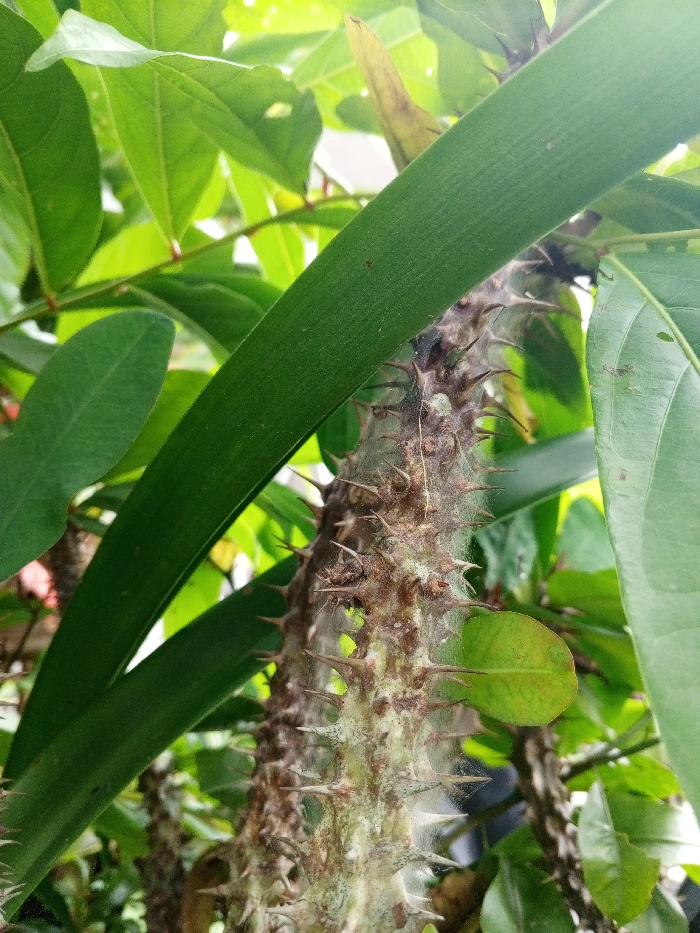 The image displays a close-up, vertical shot of a thorny plant stem located outdoors in Ciherang, Indonesia