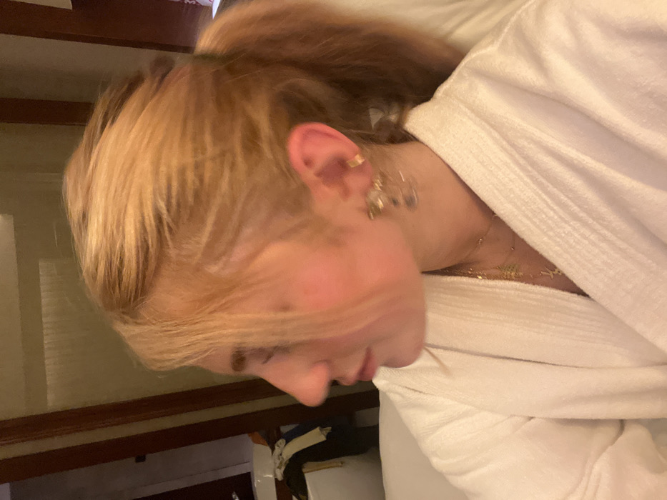 This image captures an indoor scene in Wulingyuan, China. A single individual is depicted in profile, facing left. The subject, appearing female with light blonde hair styled in a ponytail, wears a white terrycloth bathrobe. Adornments include multiple slender gold-toned necklaces, one featuring a 'W' initial pendant, a gold-toned ear cuff on the upper helix of the visible ear, and a complex dangle earring comprising multiple metallic and possibly gemstone elements on the earlobe. The background is dimly lit with warm artificial light. To the left, a white bathtub is partially visible, with several articles of clothing draped over its rim. A dark wooden vertical frame or door jamb and a reflective surface showing horizontal striations from light sources are present in the deeper background. No specific actions are observed beyond the subject's pose for the photograph.