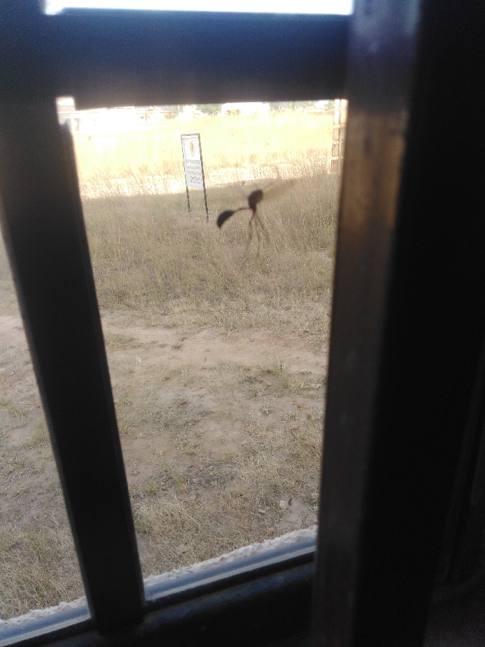 The image captures an outdoor scene in Ban, Nigeria, viewed through dark, possibly metallic, window or grille bars that frame the top, bottom, and sides. The foreground shows a patch of bare dirt ground transitioning into dry, light brown grass. In the midground, a white rectangular sign with dark, indistinct text stands on a single dark pole amidst the dry grass. Closer to the viewer than the sign, a dark, blurred insect, consistent with a large dragonfly, is suspended in mid-air, its body and two dark wings visible. The background consists of an expansive field of dry, yellow-brown grass extending to a distant, hazy horizon under bright daylight. No individuals or specific actions are discernible.