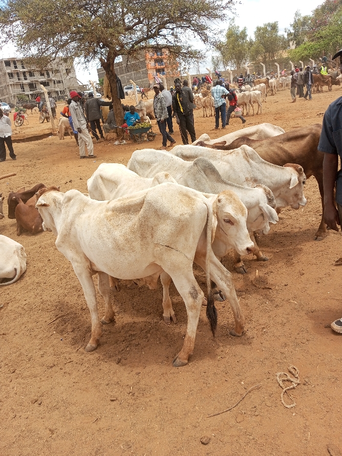 This image depicts an open-air cattle market located in a city in Katheka, Kenya
