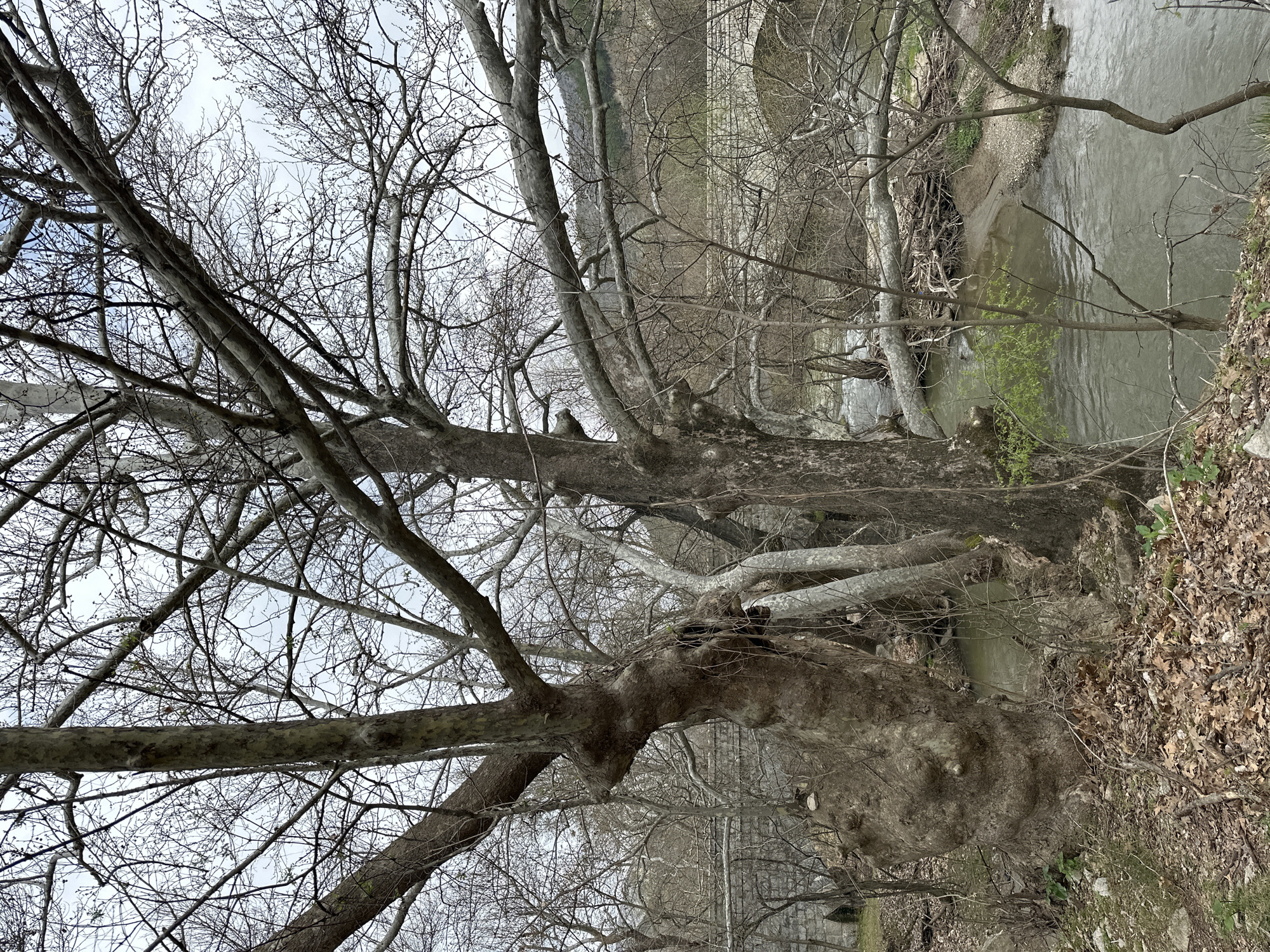 The image depicts a scene alongside a river or stream in Stara Kresna, Bulgaria. Several large, bare-branched trees dominate the foreground and middle ground, with their trunks exhibiting a gnarled and textured bark. A stone bridge is visible in the background, partially obscured by the trees and smaller branches. The water appears murky, and the riverbank is lined with foliage and fallen leaves. The sky is overcast, suggesting a dull or cloudy day.