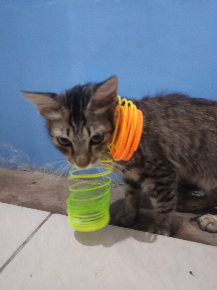 A domestic tabby cat is depicted indoors in Maleber, Indonesia. The cat, featuring grey-brown striped fur, wears multiple bright orange plastic coils around its neck, positioned like a collar. Its head is lowered, and its gaze is directed at a neon green plastic slinky toy standing vertically on the tiled floor directly in front of its face. The background consists of a solid light blue wall, with a darker horizontal surface visible between the wall and the light-colored tiled floor in the foreground. No other individuals or animals are present.