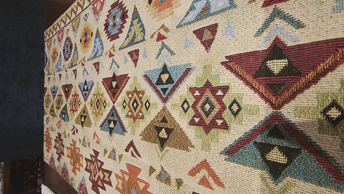 A tapestry featuring geometric, Southwestern-inspired designs is prominently displayed