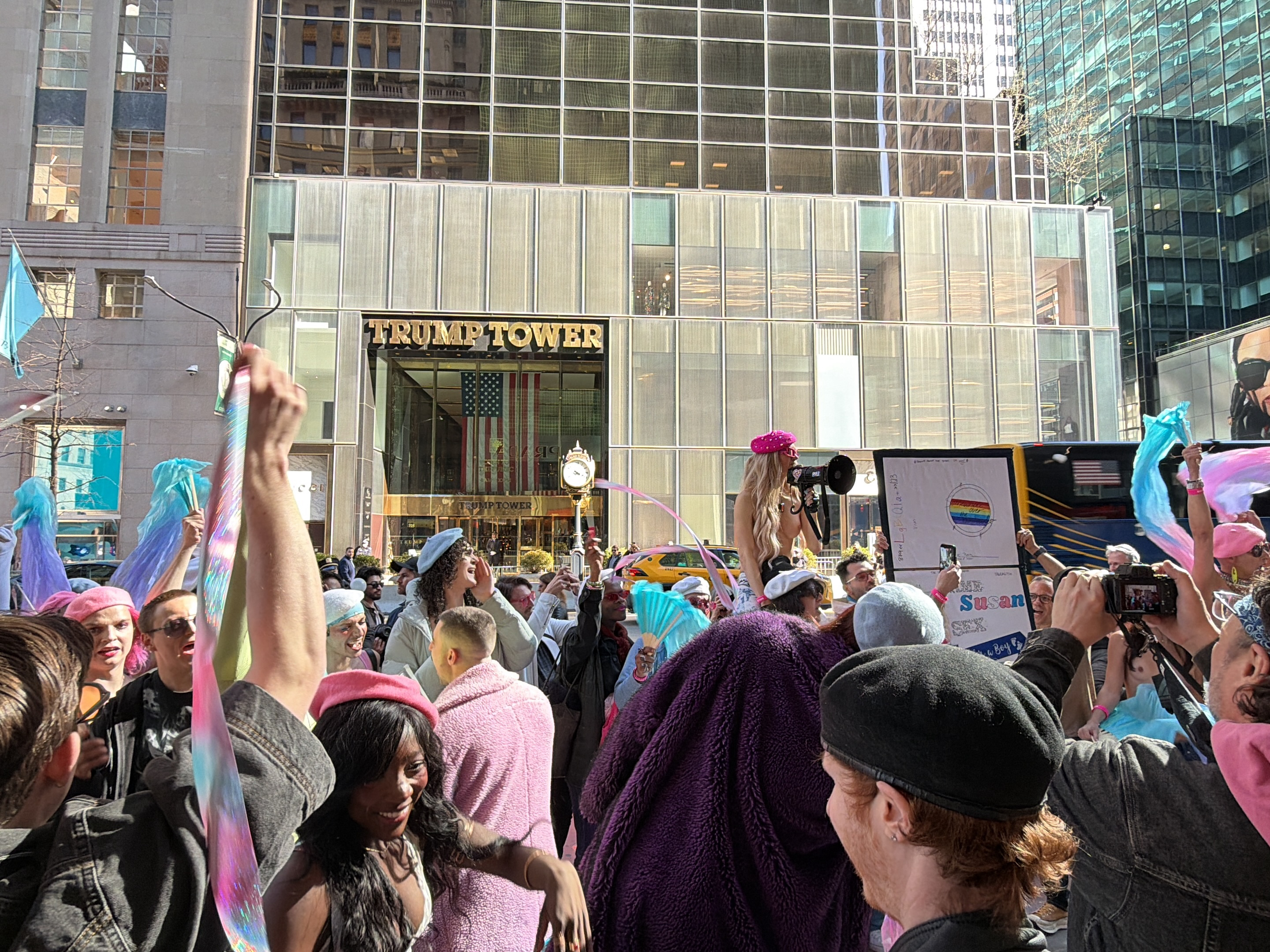 The image depicts a crowd of people gathered in front of Trump Tower in New York City. The building's sign is visible above the entrance, where an American flag hangs. The crowd appears to be part of a protest or demonstration, with people holding ribbons, signs with rainbow imagery, and a person standing on something, addressing the crowd with a megaphone. The environment is urban, with other buildings visible in the background.