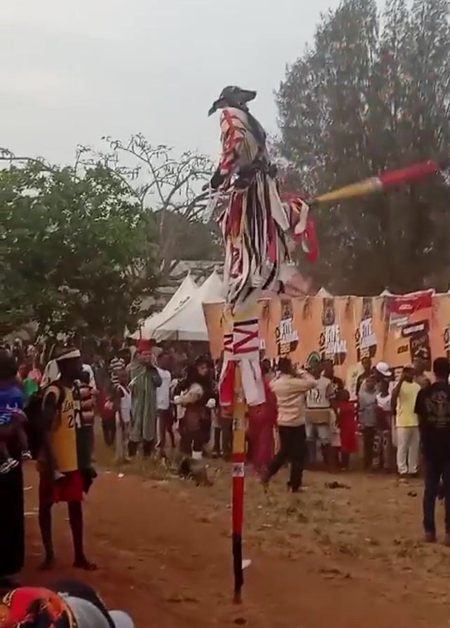 man on stilts dressed in a colorful, decorated costume, performing in front of a crowd of people. The stilts are red, and the costume features various patterns and materials. The crowd is diverse in age and attire, and they are observing the performance. The setting appears to be an outdoor event on a dirt ground, with trees and tents in the background. Banners with images are visible behind the crowd.
