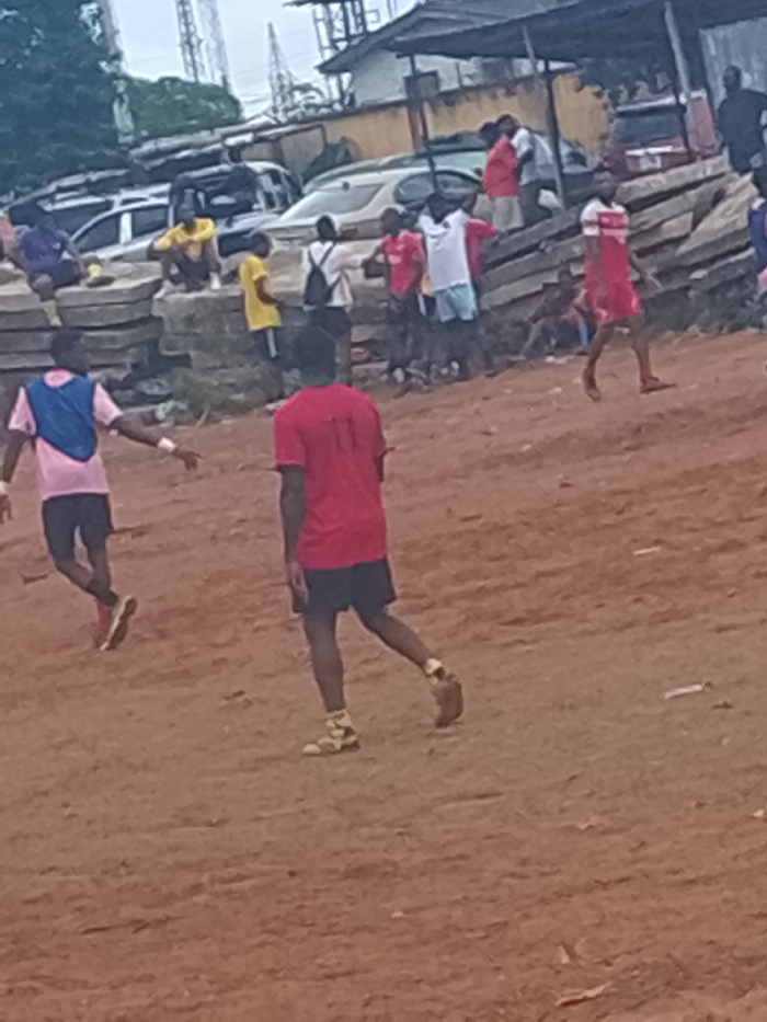 The image depicts an outdoor scene on a reddish-brown dirt field in Onitsha, Nigeria. Numerous individuals, predominantly young males, are present, suggesting a casual sports gathering or practice session. In the foreground-midground, two males are active: one wears a pink t-shirt with a blue bib, dark shorts, and red/white shoes, with his left arm extended forward. Another, seen from the back, wears a red t-shirt with the number '11' printed in white, dark shorts, and light-colored shoes over white socks, walking towards the left. To the left-midground, several individuals are seated on a stack of grey concrete blocks. One wears a yellow t-shirt, and another a purple shirt. Further right, a larger group stands and sits under a basic shelter with a dark roof supported by poles. These individuals wear various casual attire including red, white, and yellow t-shirts, and light blue shorts. One person in a red shirt and white shorts walks towards the right in this area. Behind the seated groups and shelter, multiple passenger vehicles (SUVs and cars in white, silver, and black) are parked. The background also includes light-colored building structures, green foliage on the far left, and tall metal pylon-like structures against an overcast sky. The ground is unpaved reddish-brown earth, appearing somewhat uneven.