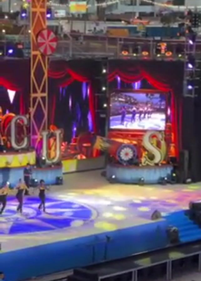 A dance troupe performs in an outdoor circus arena. Six dancers, wearing black tops and trousers with yellow accents, are seen executing synchronized steps on a large circular stage adorned with blue and white patterns. The stage is part of a larger set including circus-themed decorations like colorful wheels, gears, and the words "CIRCUS" spelled out in large, lit-up letters. A large video screen behind the performers shows what appear to be skaters in action. The audience is seated in a tiered seating area at the front of the stage. In the background, buildings and palm trees suggest an urban setting. The lighting is bright and colorful.