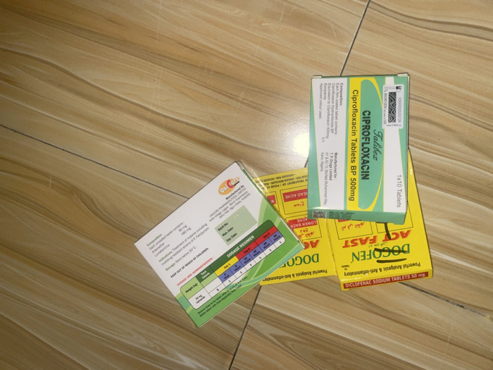 The image displays three medicine boxes on a wooden-patterned surface. A green and white box for "CIPROFLOXACIN Tablets BP 500mg" (Talibex brand) indicates it contains 1x10 tablets. A yellow box is labeled "DOGOFEN ACT FAST" Diclofenac Sodium Tablets 50 mg, described as a "Powerful Analgesic & Anti-inflammatory". A third box, of the Unite brand, shows a dosage regimen table based on weight and days of treatment, suggesting it contains medication for malaria treatment. The boxes are arranged somewhat haphazardly on the surface.