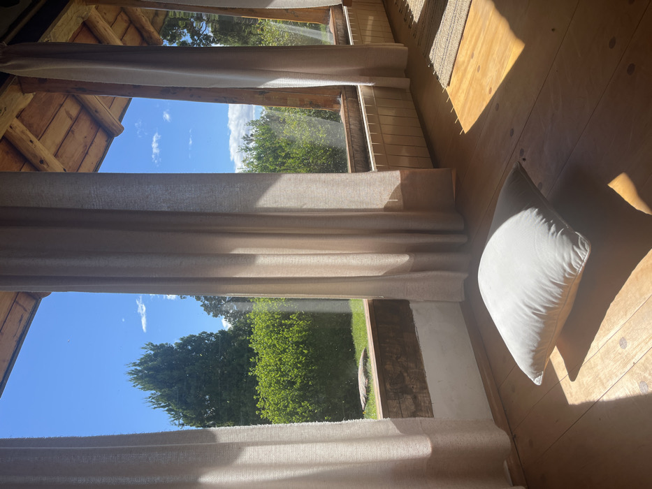 An interior scene is depicted in San Carlos de Bariloche, Argentina, looking out through a large window on a sunny day. The foreground features a light grey square cushion resting on a polished wooden floor, illuminated by direct sunlight creating strong shadows. To the right, a segment of a light-brown woven mat or rug is visible on the floor. The room features a rustic aesthetic with prominent wooden window frames and exposed wooden ceiling beams. Below the window line, a white vertical finned radiator unit is installed. Two floor-length, light beige translucent curtains are partially drawn, framing the exterior view. Beyond the window, a vibrant green outdoor environment is visible, comprising well-maintained grass, a dense row of green bushes, and several tall evergreen trees under a clear blue sky dotted with scattered white clouds. No people are present.