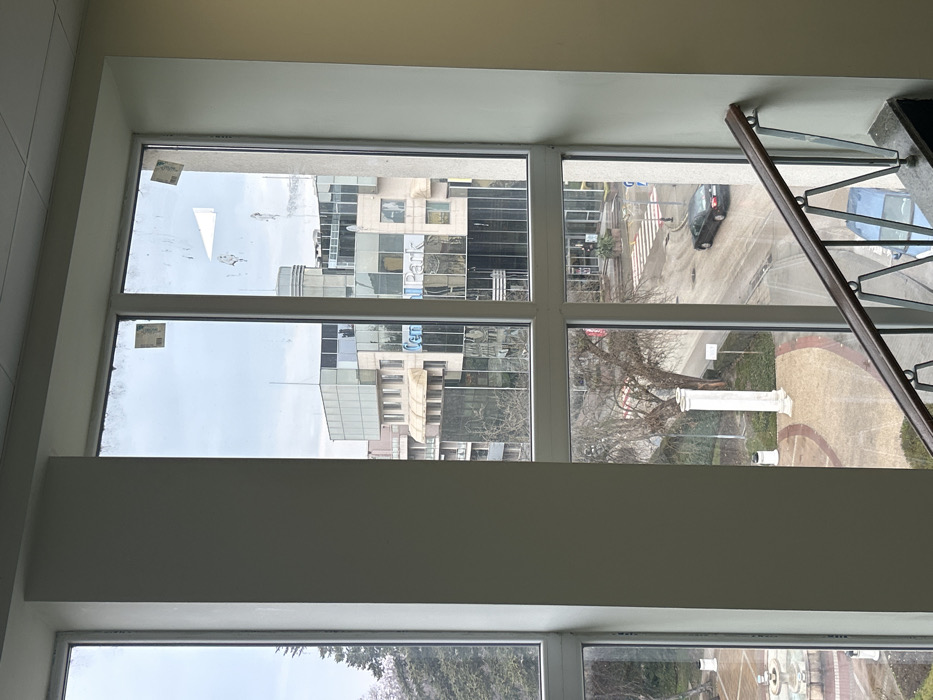 The image presents an outdoor urban scene in Silistra, Bulgaria, viewed through a multi-pane, white-framed window from an interior vantage point, likely an upper floor given the presence of a visible staircase railing. The windowpanes exhibit visible dirt, streaks, and remnants of adhesive material. The external environment is an overcast daytime setting, with wet or damp ground conditions and deciduous trees devoid of foliage, indicative of winter or early spring. Prominently centered in the upper-midground is a multi-story commercial building featuring a modern design with reflective glass and light-toned facade elements. The words "Central Park" are clearly discernible on its mirrored surface, indicating its location in Silistra. To the immediate left of this building, another multi-story structure with a beige facade and balconies is visible. Further left, a portion of a rounded, lighter-colored tower is present. A paved street occupies the mid-ground, featuring a white-striped pedestrian crosswalk. A dark-colored sedan is observed traveling rightward on this street. Below the visible window frame in the lower right, a blue vehicle is partially visible, parked on a lower level. To the left of the street, a public plaza or park area is present, characterized by patterned paving, a white stone fountain structure on the far left, and multiple white decorative columns. Bare trees are dispersed throughout this area. In the foreground, a dark brown wooden handrail with silver-colored metallic balusters diagonally ascends from the lower right. A light cream-colored interior wall is visible on the far right, and a wide white vertical support column separates sections of the window on the left.