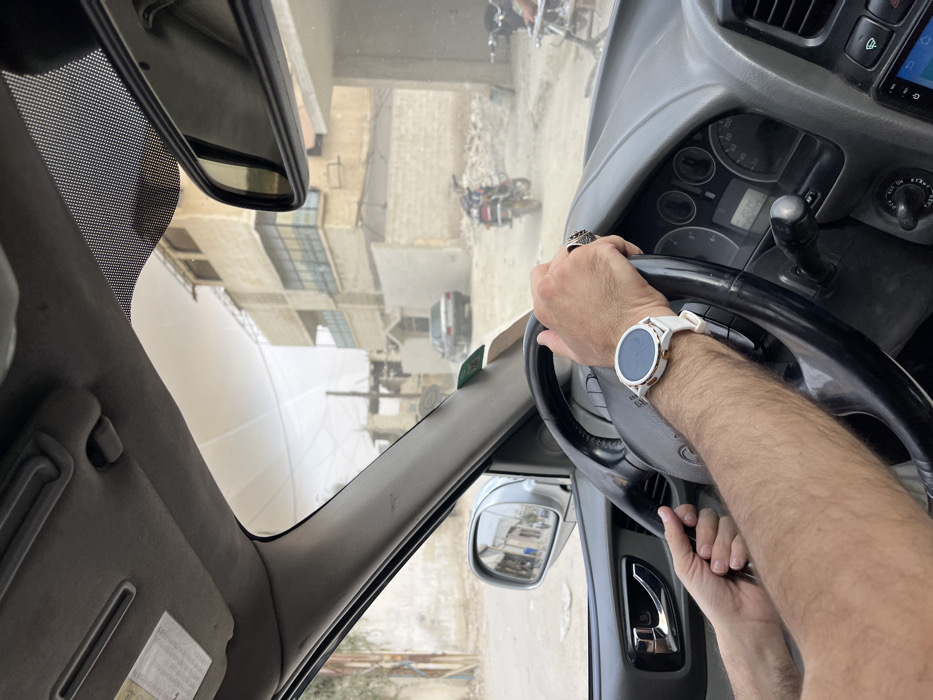 - "The image captures a first-person perspective from within a vehicle, looking forward through the windshield in Harasta, Syria" by FM-WnN6r1, licensed under CC BY 4.0