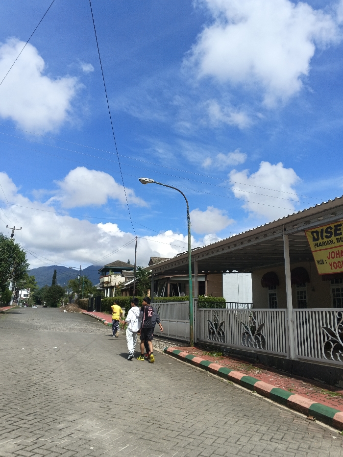 This image depicts a daytime street scene in ឃុំ ផាត់សណ្ដាយ, Cambodia, under a bright blue sky with scattered white cumulus clouds. The road surface consists of light-colored interlocking pavers arranged in a herringbone pattern, extending into the background where it curves slightly to the left. Three young individuals are walking away from the camera on the left side of the paved road. The individual farthest left wears a yellow t-shirt and dark pants. The middle individual wears a white long-sleeved top and white pants. The individual farthest right wears a dark t-shirt with a white number "10" on the back, dark shorts, and yellow footwear. To the right of the road, a curb is painted in alternating red and green segments. Beyond the curb, a white metal fence with decorative black scrollwork panels spans the length of the visible area. A green-painted street light pole with a curved arm and a single lamp fixture stands immediately behind the curb and in front of the fence. Power lines are visible overhead and connected to the pole. Behind the fence is a single-story building with light-colored walls, featuring windows with dark frames and arched accents, and a corrugated metal roof supported by a green-painted framework. A yellow banner with black text is partially visible hanging from the roof support structure on the right, displaying text such as "DISEW...", "HARIAN, BULAN...", "HUB: JOHAN", and "YOGYA". In the background, on the left side of the road, multiple buildings of varying heights and architectural styles are visible, interspersed with green trees and foliage. Further in the distance, dark green hills or mountains rise under the cloudy sky. A pile of debris or dirt is visible on the left side of the road further down.