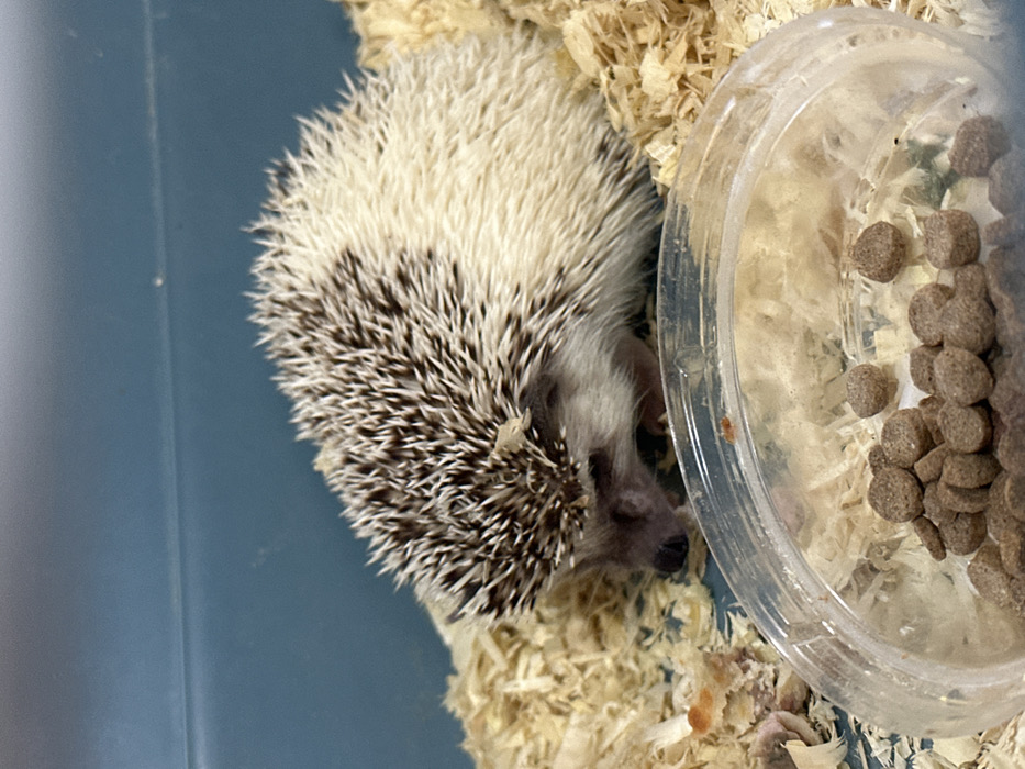 - "A bicolored hedgehog is observed within a blue plastic container filled with light-colored wood shavings" by FM-j5HwN2, licensed under CC BY 4.0