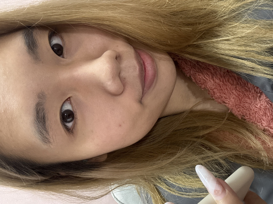 An indoor, eye-level, close-up photograph captures an East Asian female looking directly into the lens