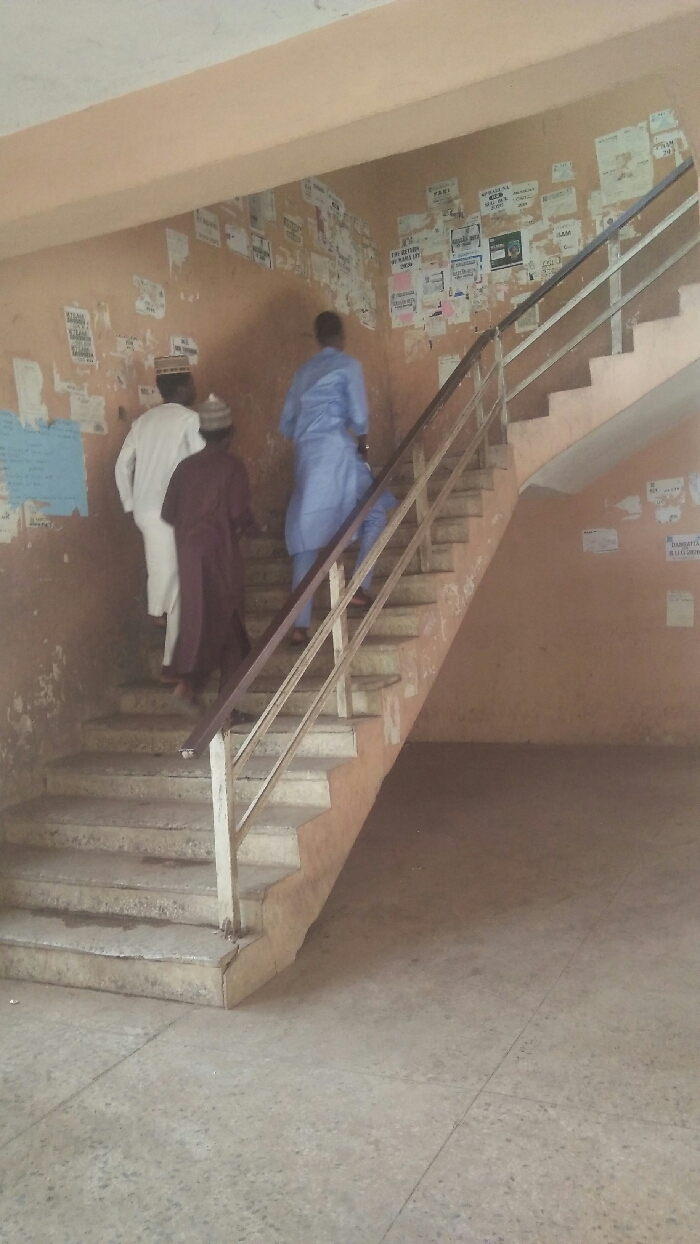 An indoor scene depicts three adult males ascending a worn concrete staircase. The individual in the lead wears a light blue tunic and trousers. The second male wears a dark reddish-brown tunic and trousers with a light cap. The third male, trailing closely, wears a white tunic and trousers with a similar light cap. All individuals are seen from behind, moving upwards. The staircase features a white or light-colored metal handrail on the right side, showing signs of wear. The walls adjacent to and beneath the staircase are painted a faded peach or light orange color, exhibiting extensive peeling paint, discoloration, and dirt. These walls are heavily covered with numerous, haphazardly affixed paper notices, flyers, and posters of various sizes and conditions. The ground floor at the base of the stairs is a light grey, worn, tiled, or concrete surface. The location is an unspecified building in the City of Unknown, Unknown.