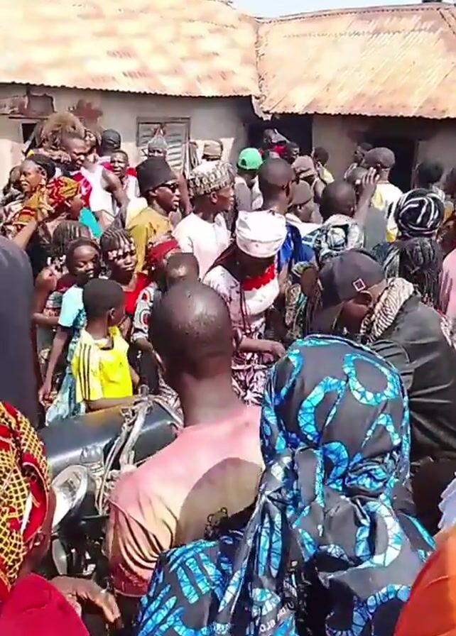 A large crowd of people, adults and children, are gathered outside a building with a corrugated iron roof. People are wearing a variety of clothing, including traditional African attire. There is a motorcycle parked in the foreground. The atmosphere seems lively, though it is unclear what is happening.