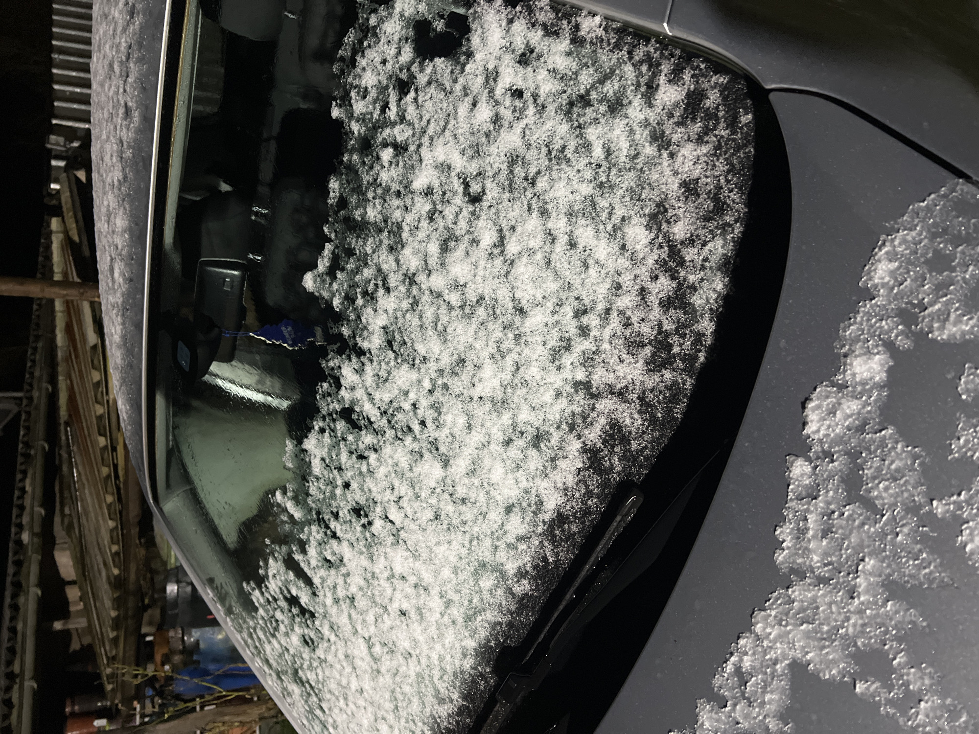 The image depicts a nocturnal outdoor scene in Wüstenrot, Germany, centered on the front exterior of a dark-colored vehicle. A layer of granular snow or ice covers the windshield, the forward section of the hood, and the roofline, with varying density. The vehicle's black windshield wipers are visible at the base of the windshield, partially obscured by the snow. Through the windshield, a blue air freshener is suspended from the rearview mirror, adjacent to a mounted electronic device, possibly a dashcam. The dimly lit background features an assortment of structures, including corrugated metal roofing, wooden supports, and blue cylindrical containers on the left, with additional fencing or structures to the right. No individuals or active subjects are present.