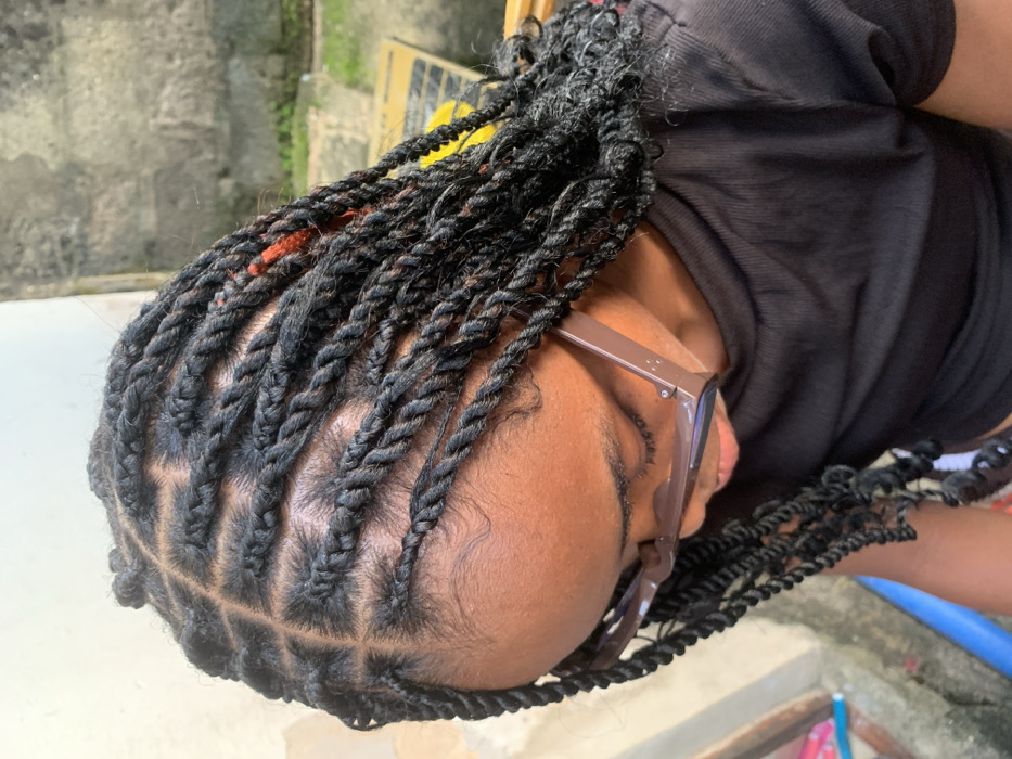 A person with dark hair styled in twisted braids is depicted