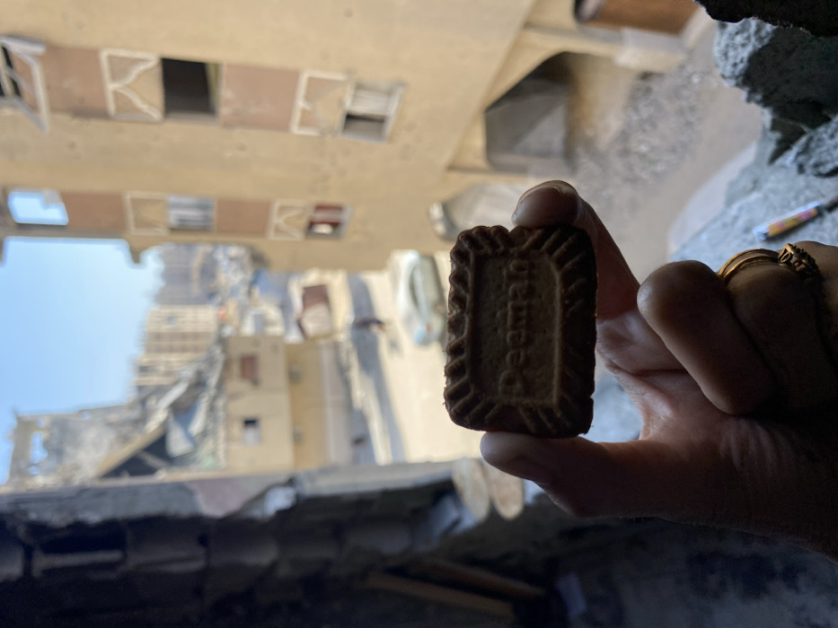 The image depicts a human hand in the foreground holding a single rectangular Deemah biscuit, which is light brown with the brand name embossed on its surface and a decorative ridged border. A gold-toned ring is visible on the index finger of the hand. The background, out of focus, presents a view of al-Qarara, Palestinian Territory. To the immediate left, a portion of a damaged building structure, consistent with rubble and exposed rebar, frames the view. Below, at street level, a light-colored sedan is visible, and a blurred individual walks on the street. To the right, a multi-story, yellowish-brown building with multiple empty or damaged window frames is present. The distant horizon reveals extensive urban devastation, with numerous partially collapsed or heavily damaged multi-story structures under a clear, bright sky.