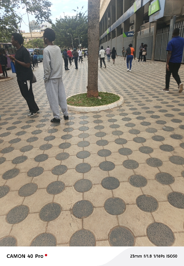 The image captures a bustling outdoor scene. A tree surrounded by greenery stands prominently on a sidewalk with a distinctive circular-patterned paving. Multiple people are walking or standing nearby, some heading towards a building with an ATM. Two figures are closer to the foreground, one wearing a grey sweatshirt and the other in black. The shot is taken with a CAMON 40 Pro, at 23mm, f/1.8, 1/169s and ISO50.
