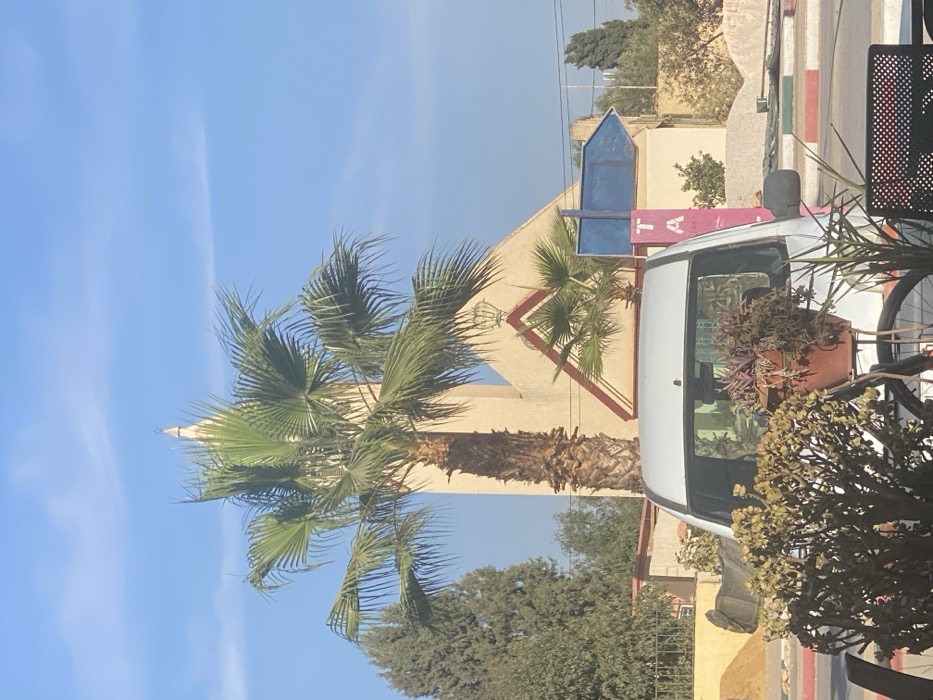 The image captures an outdoor daytime scene in Ain Taoujdate, Morocco, under a clear blue sky