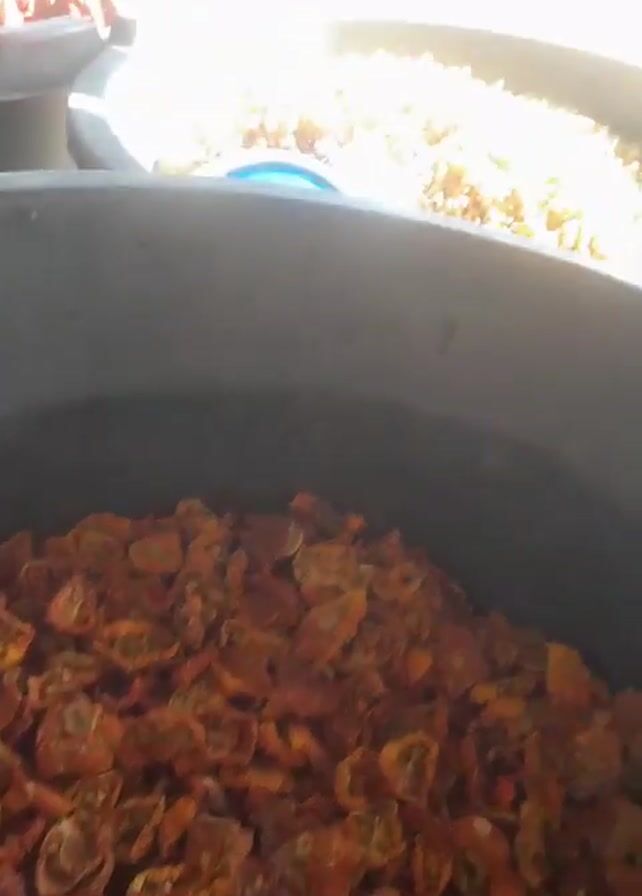 three large, gray tubs filled with food. The first tub contains dried tomatoes. The second tub contains small, dried noodles with a blue cup and a silver metal cup. The third tub appears to contain dried peppers. The tubs are outdoors in a sunny area. The environment includes trees, sand, and buildings.