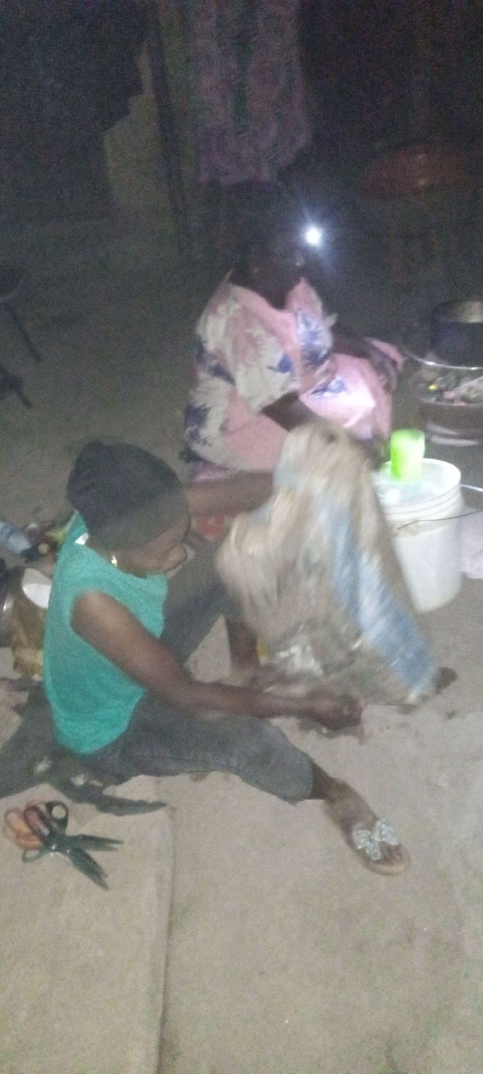 The image depicts an evening or nighttime scene in Sabon Tasha, Nigeria, featuring two individuals seated on a light-colored ground surface. In the left foreground, a person wearing a dark head covering, a teal sleeveless top, and dark trousers is observed. A single patterned sandal is on their right foot, and a gold-colored earring is visible on their right ear. This individual is actively holding and manipulating a large, light-colored, possibly woven bag containing an indistinct material. A pair of black-handled scissors with orange accents lies on the ground to their left. In the right background, another person is seated, adorned in a light-colored, pink and blue patterned garment. A distinct, bright, circular light source, consistent with a headlamp or handheld flashlight, is positioned above their head, providing primary illumination. To the immediate right of this background individual, a white plastic bucket with a green item on its lid and a dark pot are visible. The overall environment is dimly lit, relying on the artificial light source.