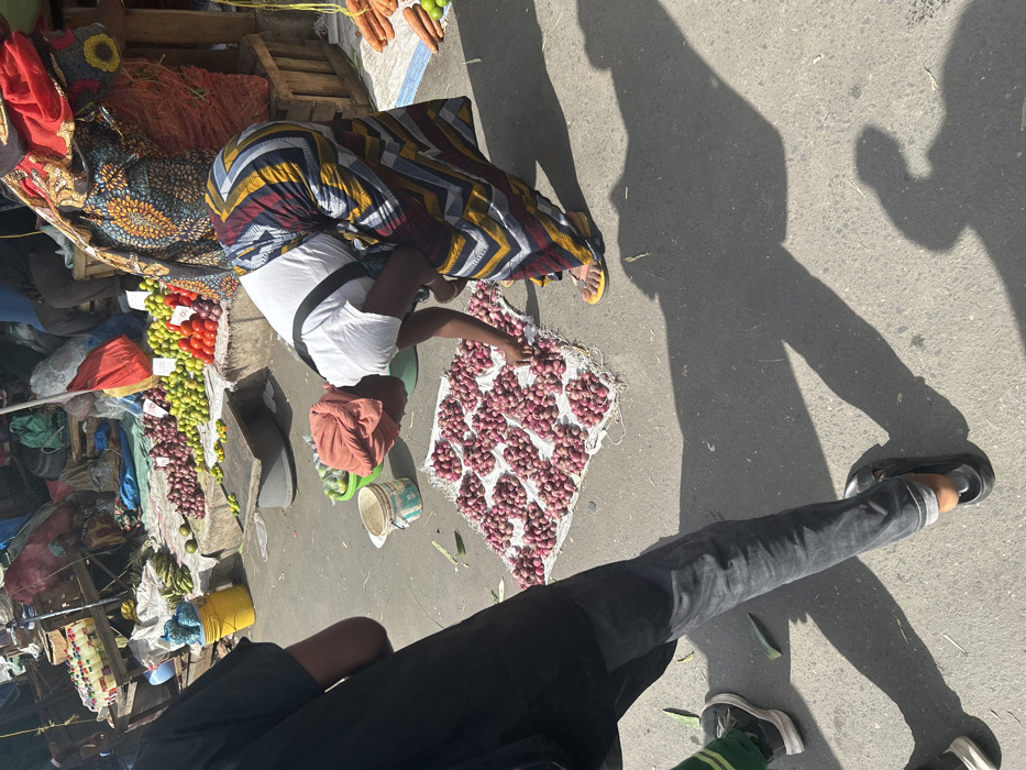 An outdoor market scene shows a person wearing a patterned skirt, white top, and head wrap kneeling to sort onions laid out on a white cloth. Next to her are other produce items like tomatoes and green fruit. To the bottom of the image, another person is visible with dark pants and athletic shoes. The scene is brightly lit, casting long shadows across the ground.